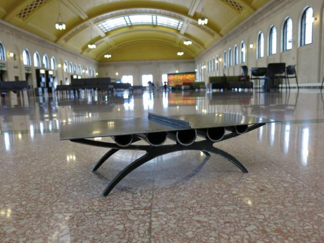 It’s a game. It’s a tool. It’s an instrument. A game object and art instrument. The artist team has embraced the concept of Union Depot as the “Living Room of St. Paul” by combining sculpture and community game play. They have designed a multi-use pingpong table, Union Table, that acts as a place for entertainment, a tool for creating conversations and an interactive musical instrument for exploration and expression. Table tennis can be played by people of any age or skill level including singles and doubles. Grab a couple of paddles to enjoy a game with a friend, challenge a stranger to a friendly match, or grab the percussion mallets and improvise some music. The artists received a commission to create Union Table as part of the Union Depot Public Art Program. Keesecker is an artist specializing in composition and multimedia art. MacGuffie is a sculpture artist who often works in steel, and Thompson specializes in interactive/participatory activities in unexpected places.